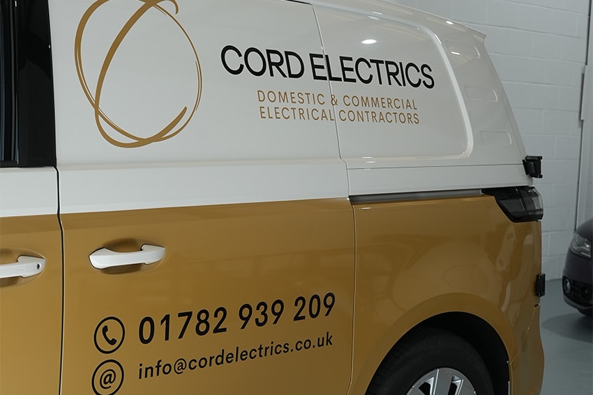 Our design team developed the layout in Illustrator, giving the client a clear visual of the final look before production began. The wrap design was created around Cord Electrics’ brand identity, ensuring the colour palette and logo placement represented their industry and values accurately.
